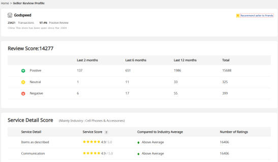 Alt Text: DHgate supplier rating and buyer reviews example